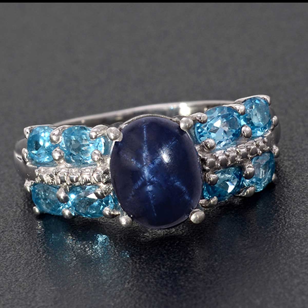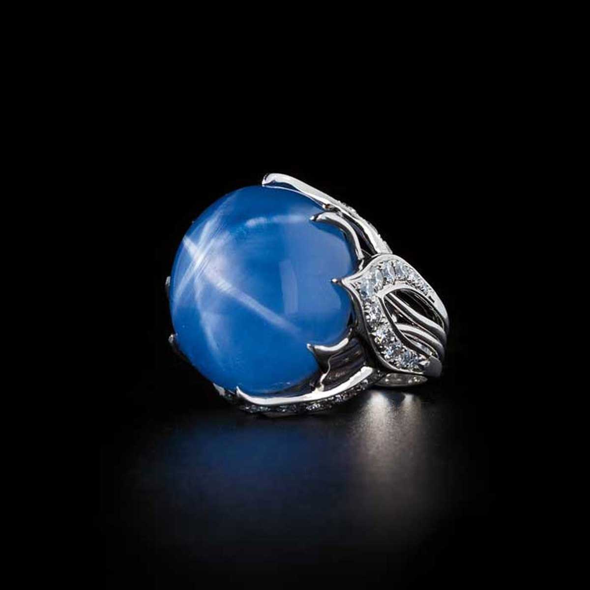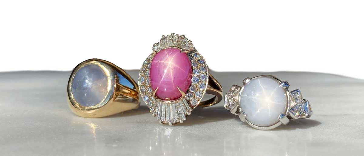 A cabochon-cut Star Sapphire characteristically shows a six-rayed star, caused by needle-like “silk” inclusions that reflect and scatter light. Star Sapphires range from semitransparent to opaque, in many of the same colours as non-phenomenal Sapphires.